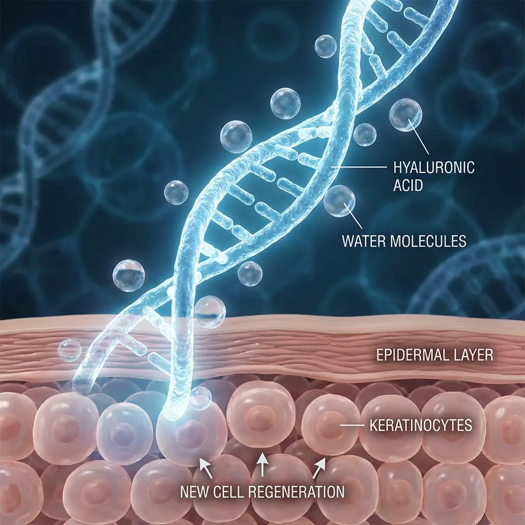 Hyaluronic Acid (HA) โมเลกุลขนาดใหญ่ — กักเก็บน้ำในชั้นผิว เพิ่มความอิ่มฟูและยืดหยุ่น พร้อมกระตุ้นการสร้างเซลล์ผิวใหม่