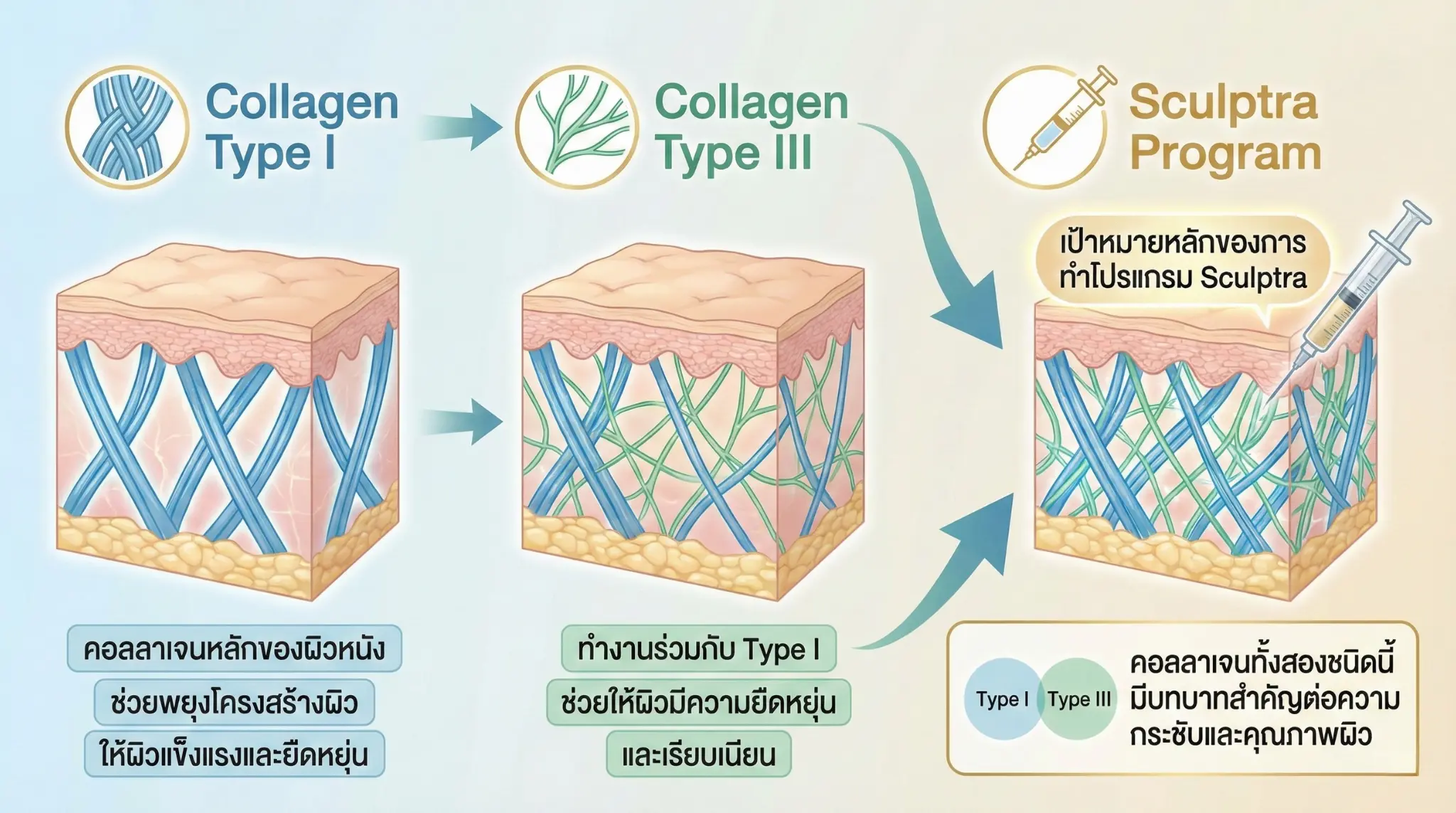 คอลลาเจนทั้งสองชนิดนี้มีบทบาทสำคัญต่อความกระชับและคุณภาพผิว ซึ่งเป็นเป้าหมายหลักของการทำโปรแกรม Sculptra